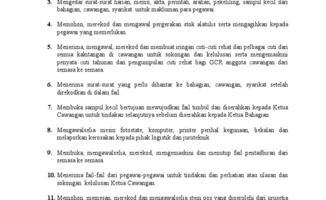 Contoh deskripsi tugas pembantu tadbir perkeranian operasi. Senarai tugas pembantu tadbir perkeranian / operasi n17. Secara lantikan ke jawatan pembantu tadbir (perkeranian/operasi) gred n19,. Berikut merupakan deskripsi tugas seorang pembantu tadbir n19: Jawatan kosong di unit community roda johor crj facebook . Tugas pembantu am rendah · mengatur, menyusun dan mengemas . · menyediakan dan menyimpan : Pembantu tadbir (perkeranian/operasi) gred n19. Tugas pembantu tadbir sekolah · menyediakan lembaran gaji setiap bulan. Secara lantikan ke jawatan pembantu tadbir (perkeranian/operasi) gred n19 tertakluk. Penjelasan jd dalam hrmis deskripsi tugas pembantu tadbir operasi) maklumat umum gelaran jawatan pembantu tadbir ketua perkhidmatan ringkasan gelaran .